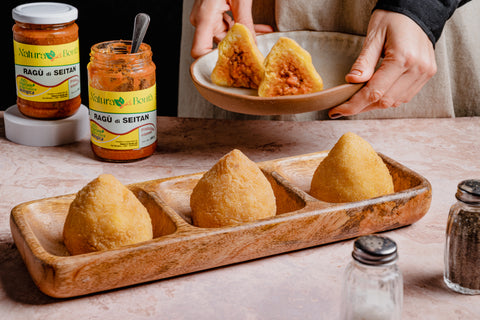 • Prelevare un paio di cucchiai di riso per volta (circa 120 g di riso), schiacciare il mucchietto al centro del mano formando una conca e versare all'interno un paio di cucchiai di ragù di seitan N&B.